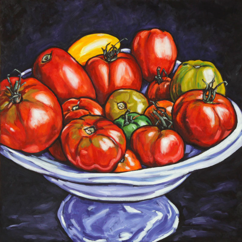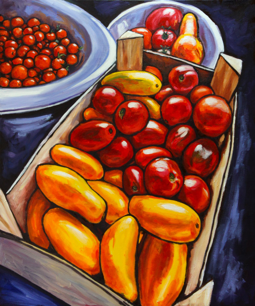 This series of paintings celebrates the harvests of our gardens and our farmers markets; not the products from industrial agriculture, but the real stuff, the vegetables and fruits that look imperfect but have real taste. Here, colour represents taste.