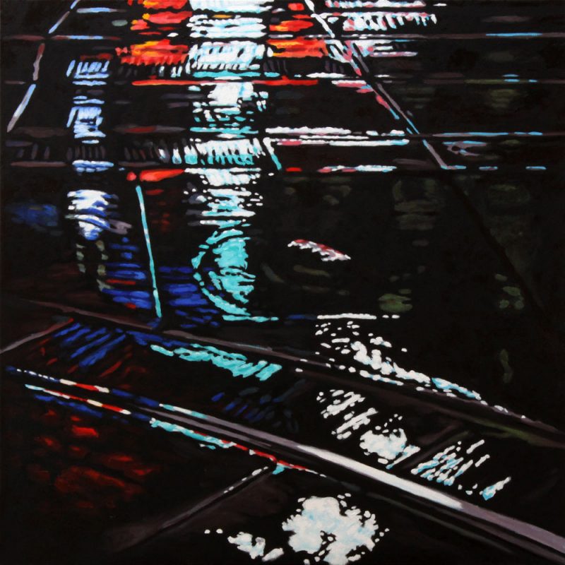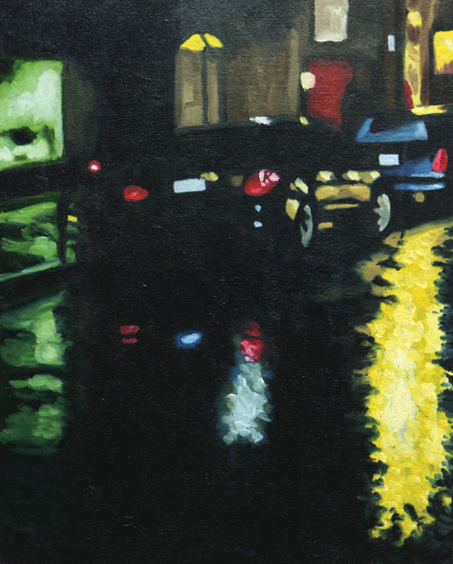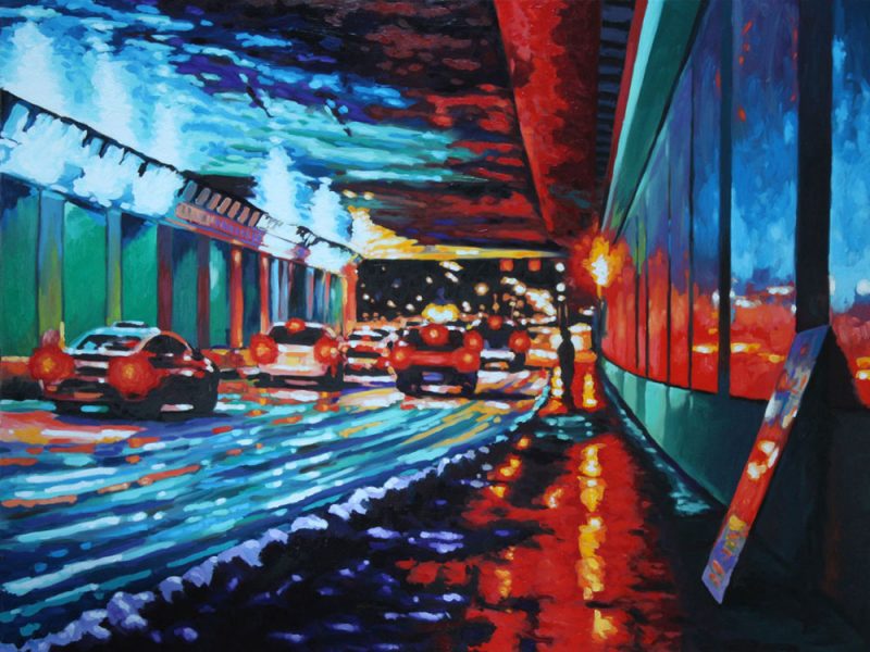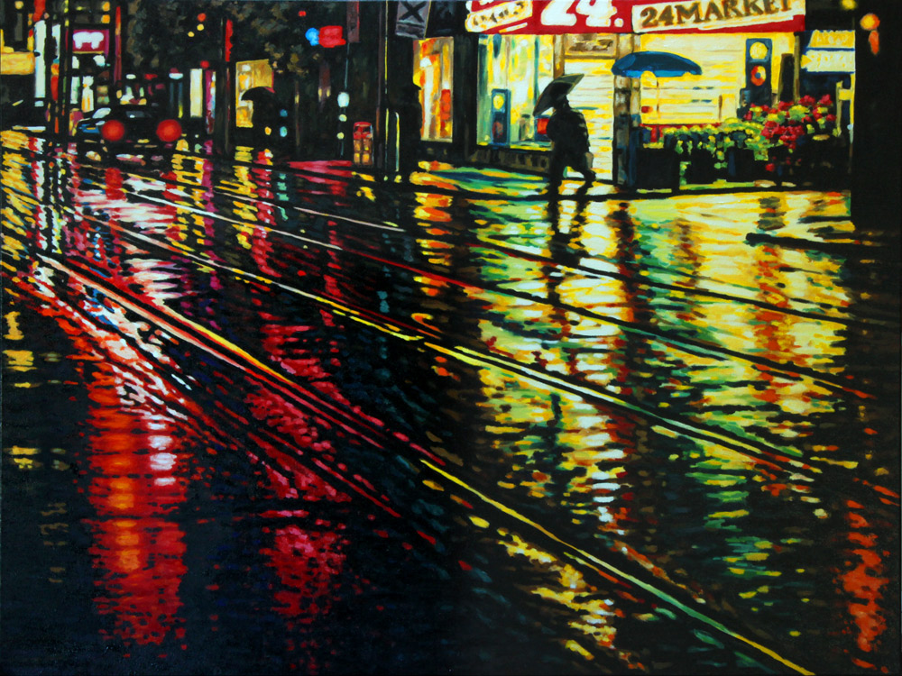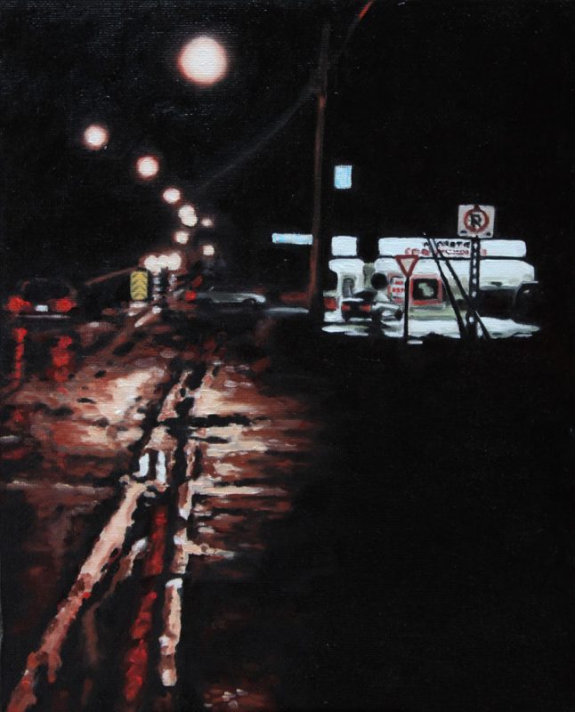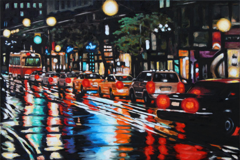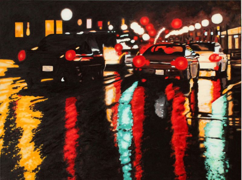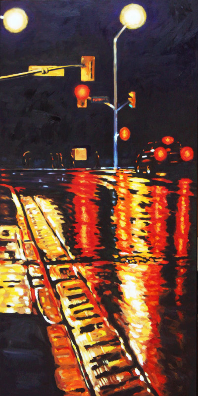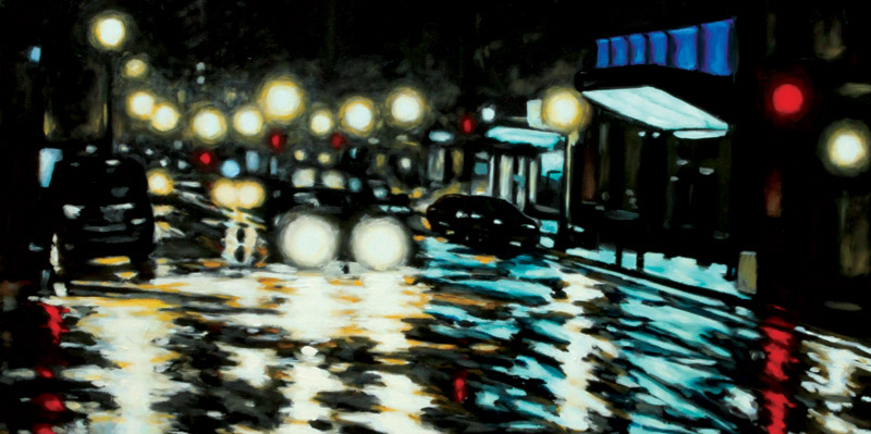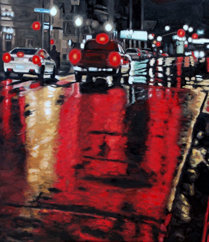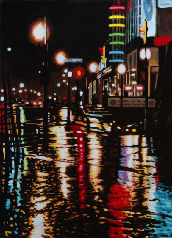 Contemporary Canadian life is concentrated in urban centres. The landscape that many see is man-made and built-up, experienced 24 hours a day—a world away from the uninhabited wilderness and pastoral scenery of traditional Canadian landscape painting. This series of paintings pays a testament to the vibrancy of the city at night: traffic lights, shop windows and neon signs are reflected and enhanced on rainy streets. Gleaming reflections exaggerate the contrasts between deep darks and artificial lights. It is the same world as during the day, but stripped of its blandness.