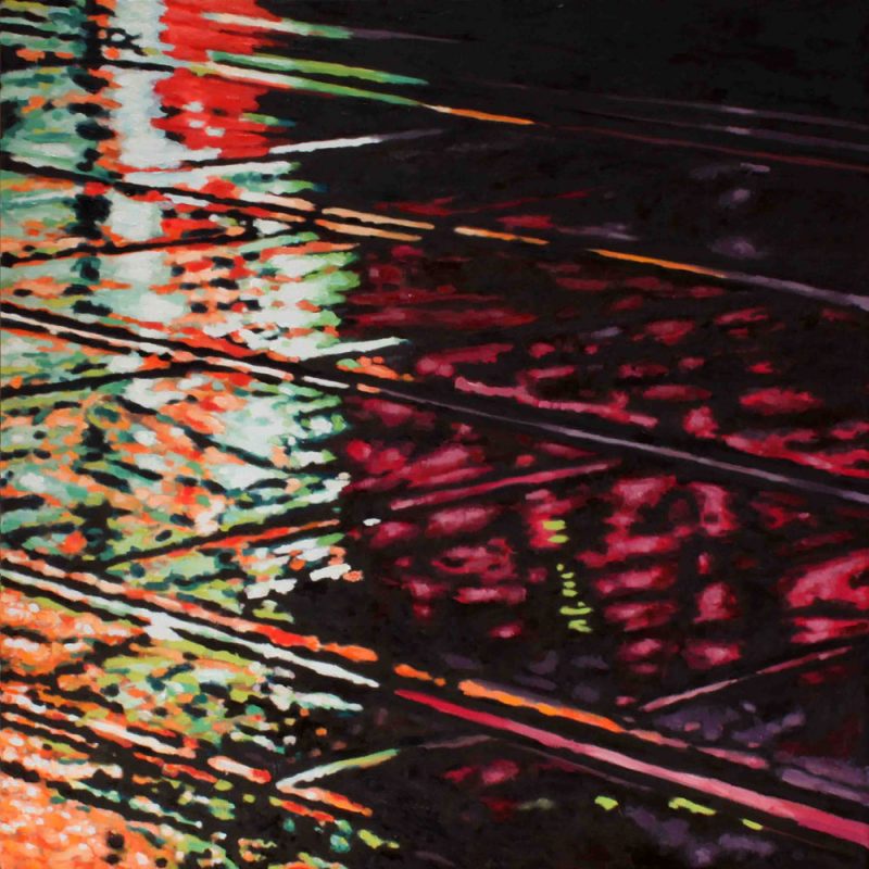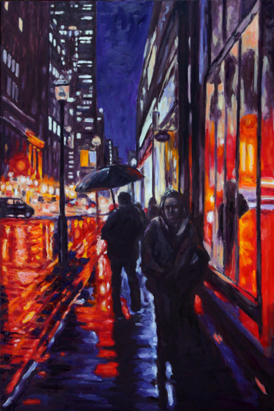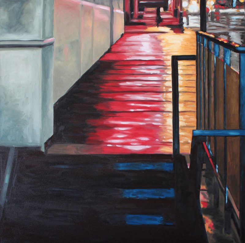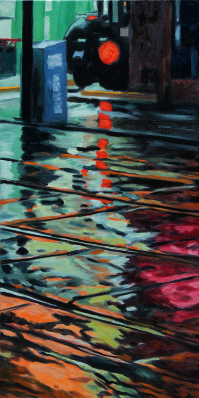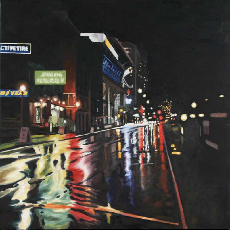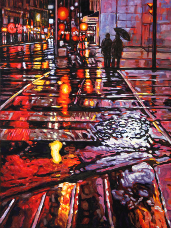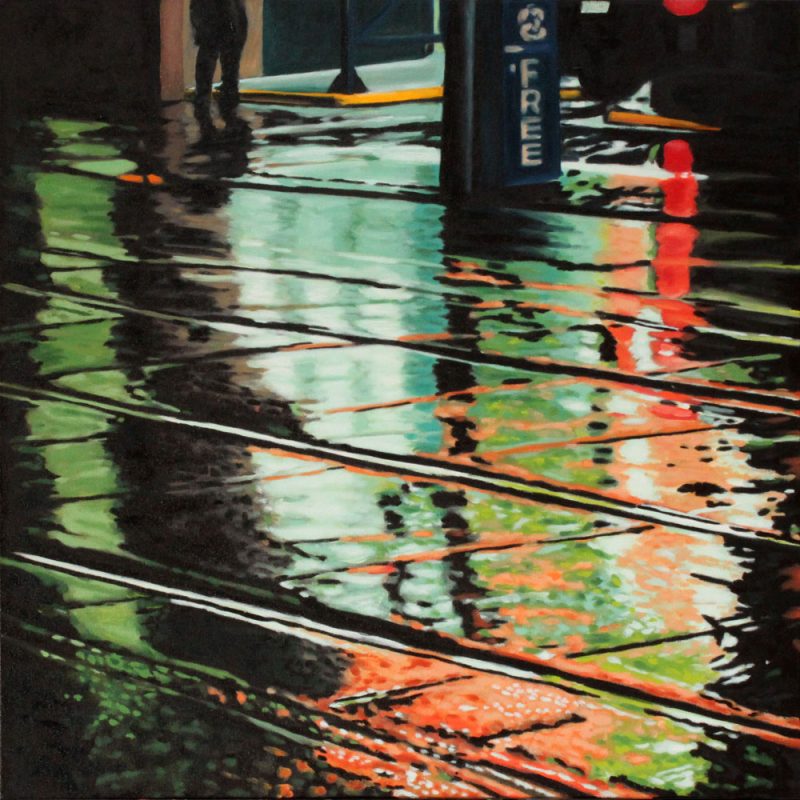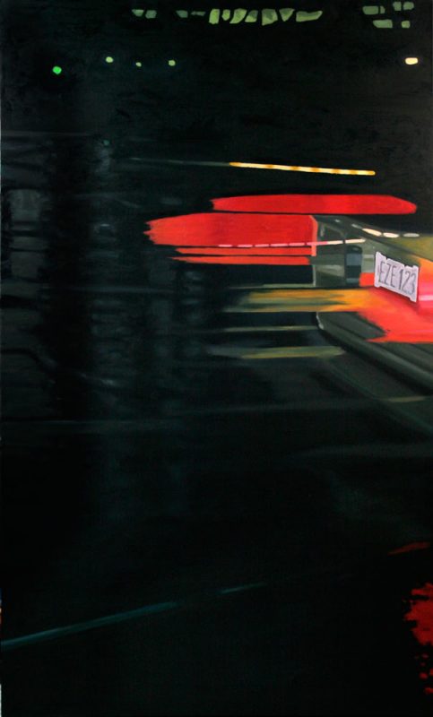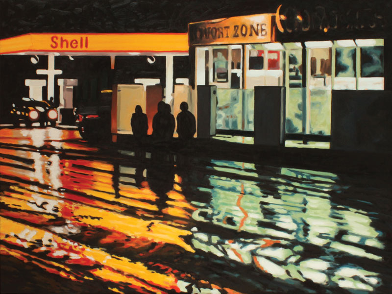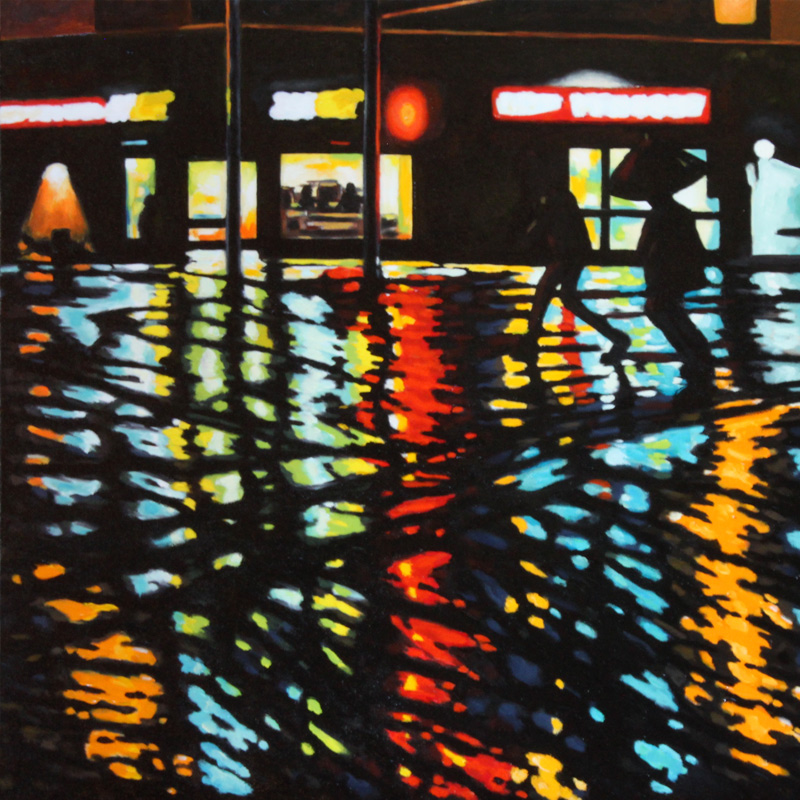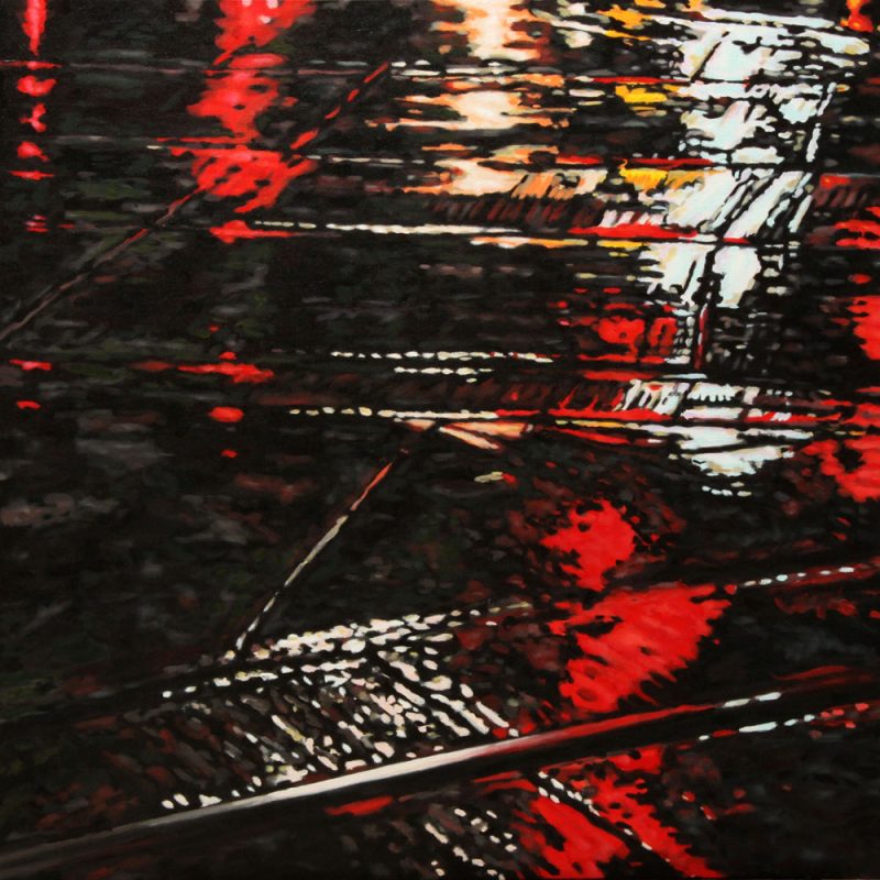 Contemporary Canadian life is concentrated in urban centres. The landscape that many see is man-made and built-up, experienced 24 hours a day—a world away from the uninhabited wilderness and pastoral scenery of traditional Canadian landscape painting. This series of paintings pays a testament to the vibrancy of the city at night: traffic lights, shop windows and neon signs are reflected and enhanced on rainy streets. Gleaming reflections exaggerate the contrasts between deep darks and artificial lights. It is the same world as during the day, but stripped of its blandness.
