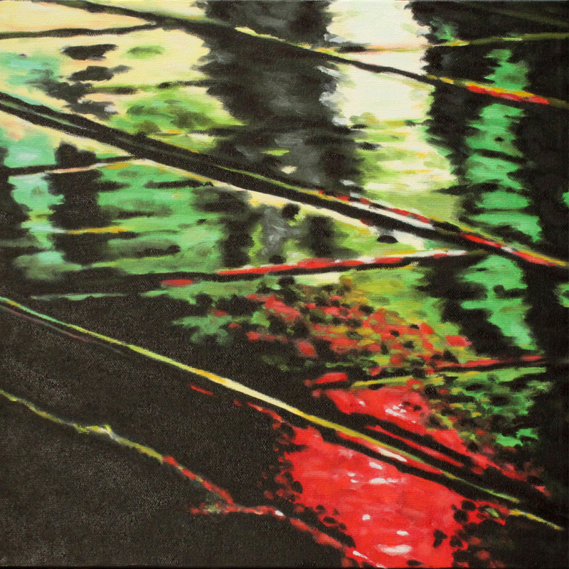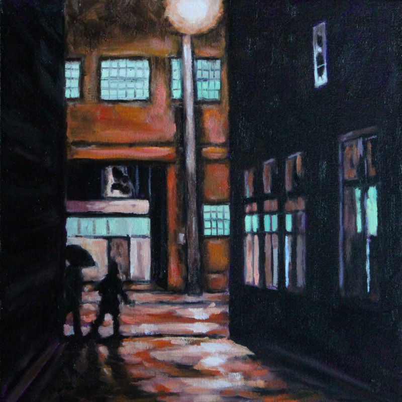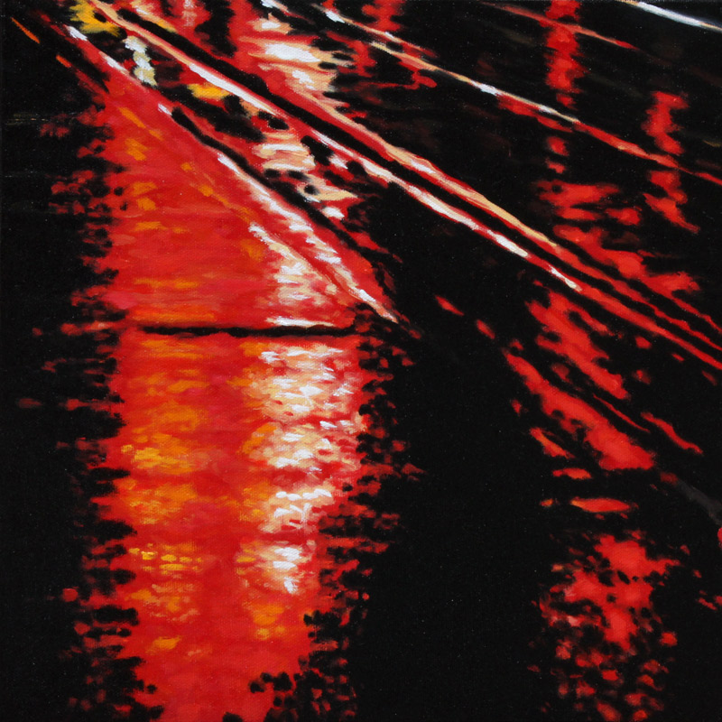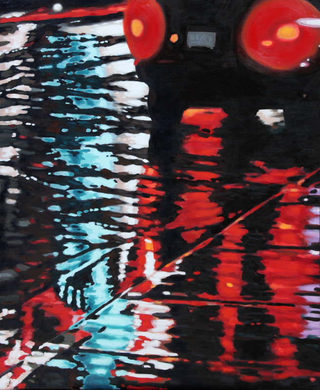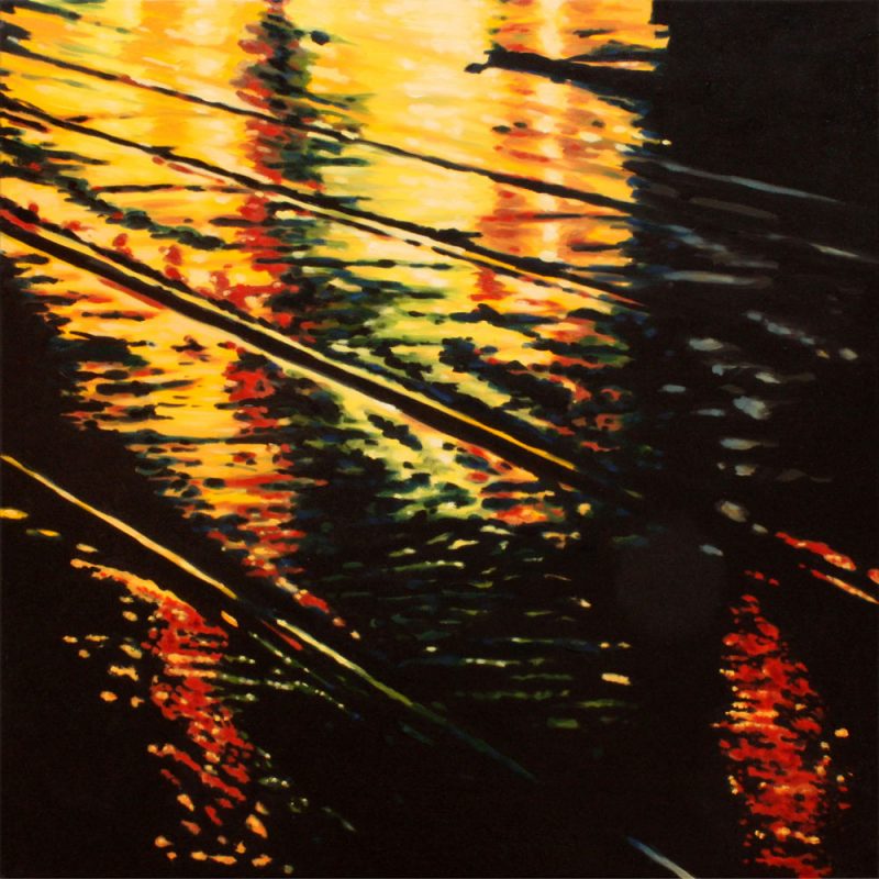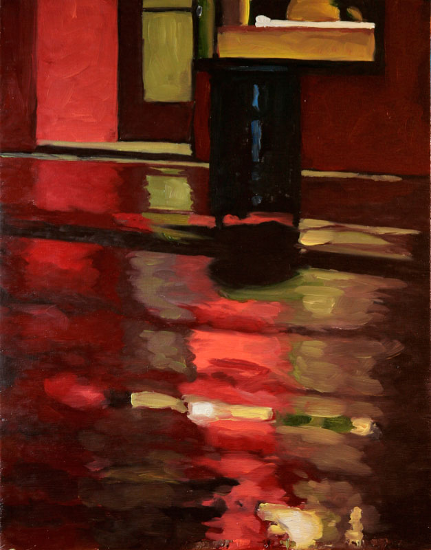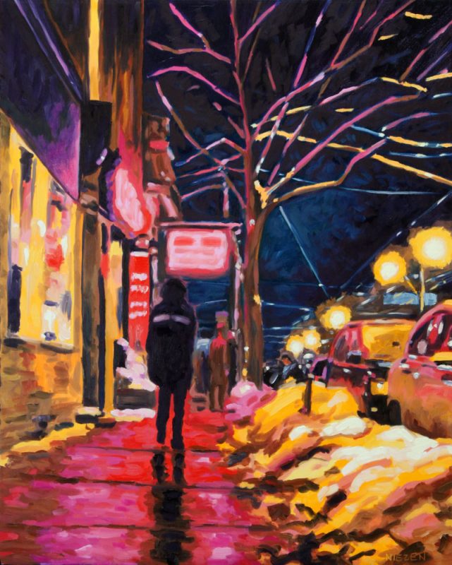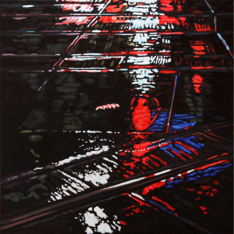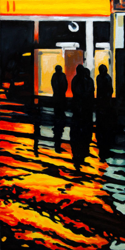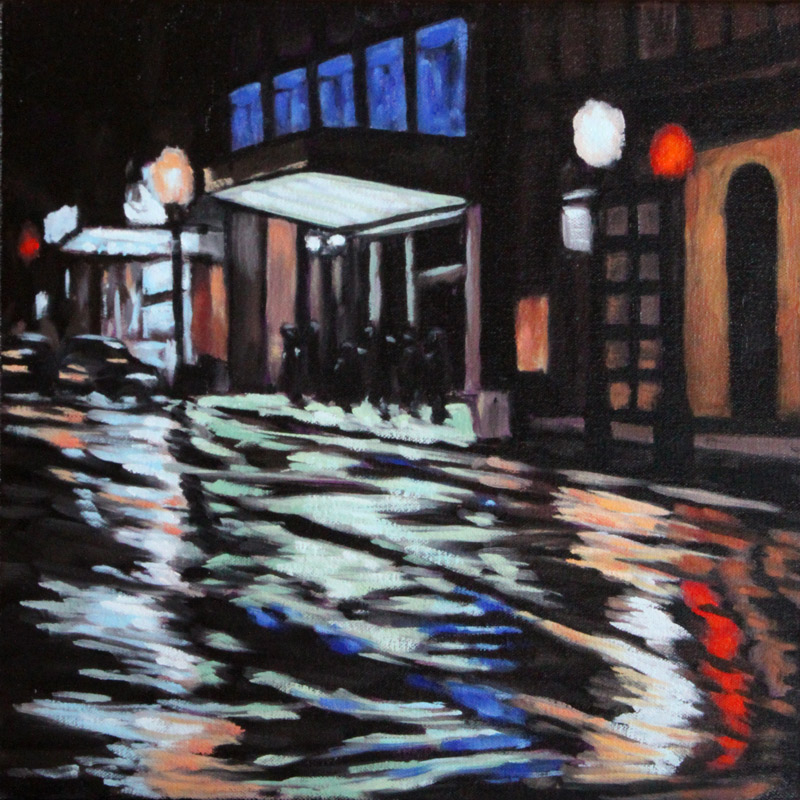 Contemporary Canadian life is concentrated in urban centres. The landscape that many see is man-made and built-up, experienced 24 hours a day—a world away from the uninhabited wilderness and pastoral scenery of traditional Canadian landscape painting. This series of paintings pays a testament to the vibrancy of the city at night: traffic lights, shop windows and neon signs are reflected and enhanced on rainy streets. Gleaming reflections exaggerate the contrasts between deep darks and artificial lights. It is the same world as during the day, but stripped of its blandness.