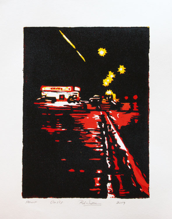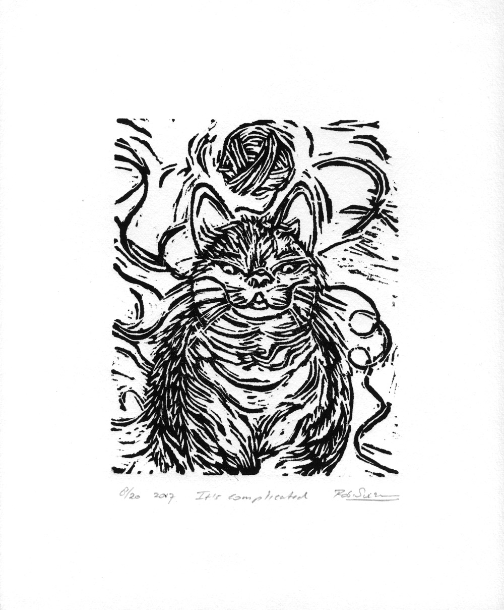 In printmaking I experiment, with linocuts, including reduction prints, blind emboss, collage (stamps), and text. My printmaking is influenced by European graphic novels and Dutch graphic tradition. Having worked in advertising and commercial graphic design for 25 years in Europe and Canada has informed my approach to layout and composition. As a result, narrative and contrast are important elements in my work.